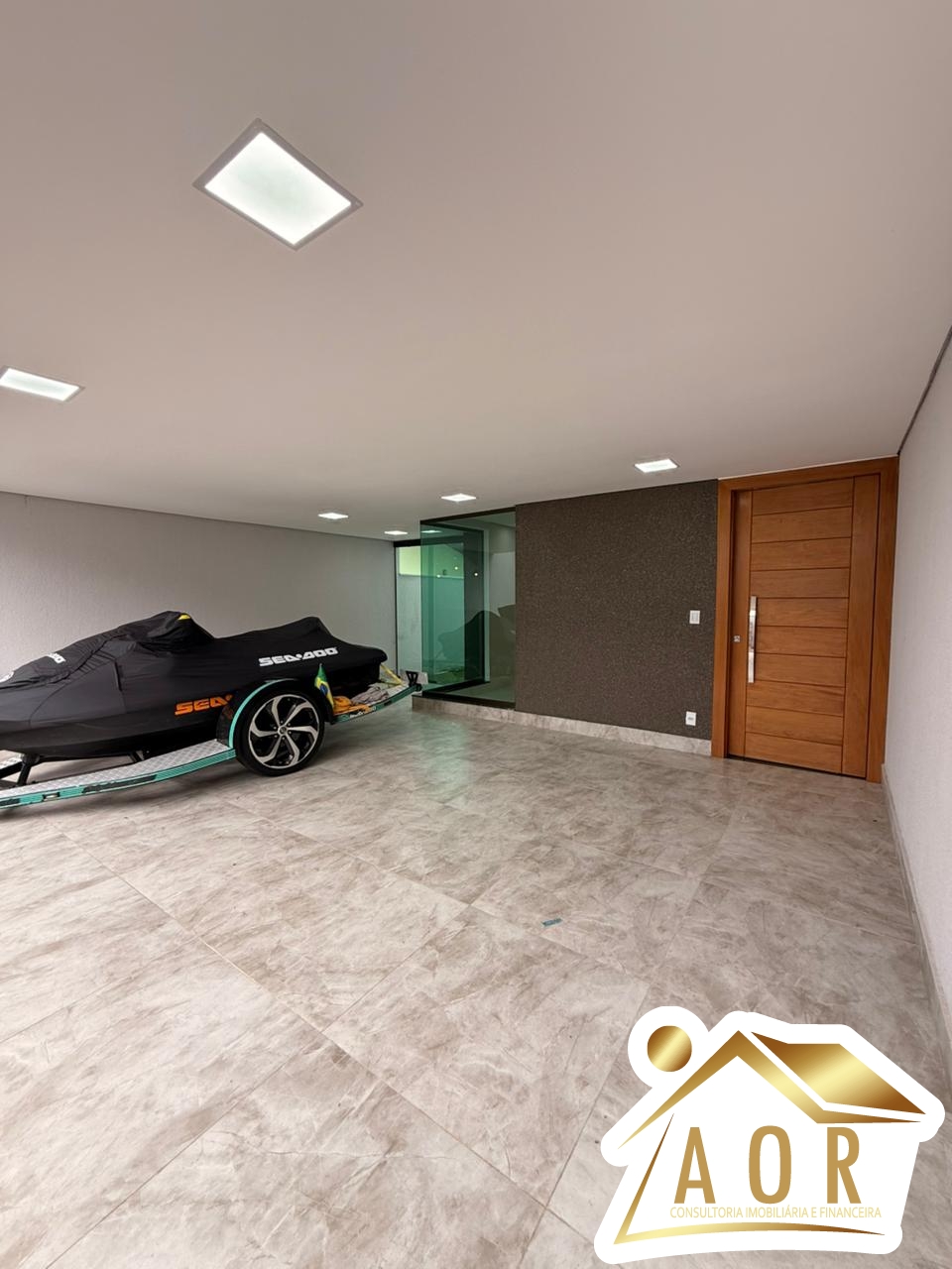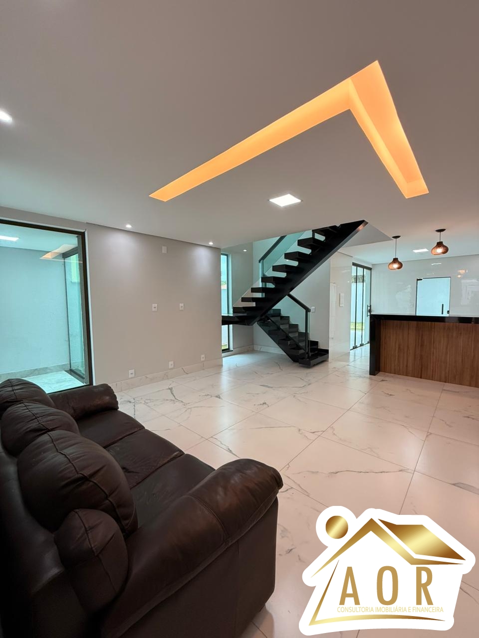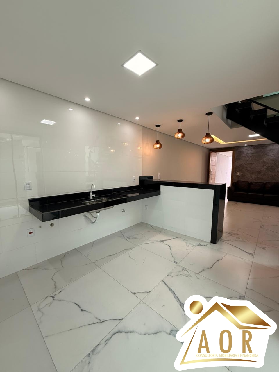1º Pavimento: Sala ampla para 02 ambientes, cozinha com bancada de granito, área de serviços coberta com bancada, área gourmet com churrasqueira e bancada, 01 banheiro social, garagem para até 05 carros.